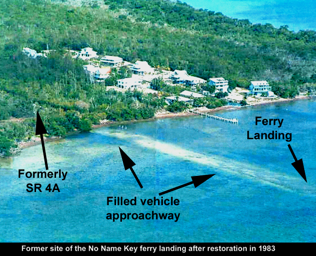 Just the announcement of a new bridge caused some ownership changes, and by 1970 there were two canals and 92 developed lots prepared. There were no public electricity or water available. This did attract some folk who preferred the 'back to nature' living style, while others thought it was just a question of time before these amenities would exist. Some built bare-bone houses while others built models of conservation and wise usage building materials and living space. Solar panels, wind mills, and generators provided electricity; cisterns collected rain water from roofs. Some shallow wells provided minimum potable water and fine mesh screens kept out the small insects. ![]() The Florida Department of Environment Protection (FDEP) restored the shoreline at the ferry landing wiping out all the ferry landing's artifacts in 1982/3 with the Audubon Society's support/funds. The site was not on the Florida State historic Site File, or the Key West Preservation Board's list; therefore, not considered historically significant. They removed Dynamite Docks on Key Largo in the same time period. See the undated photo to the right, but obviously later than 1983. Click to enlarge. Modernization, official 'comp plans,' electricity, water and wastewater are concerns by a divided group of residents. Monroe County is a state mandated as an "Area of Critical State Concern," and all building permits must be cleared through Tallahassee, Florida - the capital. The designation as ACSC has many more connotations than just building permits. There have been numerous large developments proposed since the new bridge. To name one that was, perhaps still is, the Galleon Bay in the late 1990s. It was not a huge development - only 13 single-family dwellings. The contention was based on Monroe County's Comprehensive Use Plan. Most counties in Florida now know of 'Comp Plans.' Being in the 8,542 acre National Key Deer Refuge and lack of public electricity and potable water did not help the cause. Recently a central wastewater system was proposed. The last time at bat, the County Commissioners opposed it after having proposed it in the first place. Today, April 19, 2009, No Name Key remains without public electricity and potable water. There are about 45 homeowners on the Key at the time of this writing in 2009. Concrete foundations of the No Name Lodge remain close to a familiar clue of an early Keys development - a cluster of four mature date palms. No Name Key is probably Monroe County's last privately-owned 'last frontier.' On 29 May 2013, residents began connecting to public electricity. |