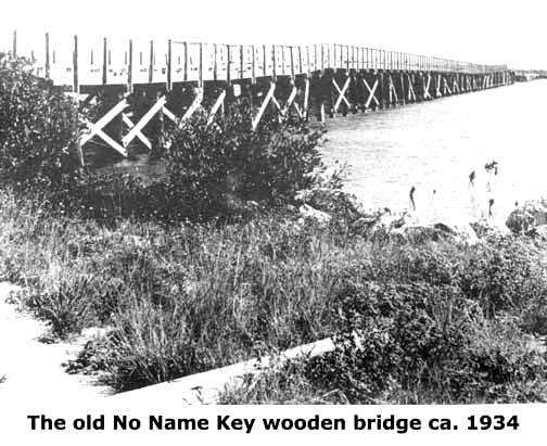 Name Key. Visited on September 11, 1935. With WW-II over, the 1950s began the present growth movement throughout the Keys; however, without vehicular access, No Name Key sank into a slumbering, uninhabited wilderness other than the Key Deer. Ranger Jack Watson, Mr. Key Deer of the National Key Deer Refuge was very pleased. Per acre there were more Key Deer on NNK than its neighbor BPK. Trees still produced sapodillas, but there was no one to pick them. Greenery eventually completely overgrew the old highway other than a small tunnel opening for the deer. Not that many years passed before another group moved in, I should say groups. First, was a 1960 proposal to build a 7,000--foot causeway from West Summerland Key to No Name's southern end. This was opposed by many; it was not just the causeway, but the significant fishing grounds it would disrupt. Descendants of the Gibson family now living on Big Pine Key were particularly opposed for a number of reasons. One was the causeway would act as a dam and trap hurricane waters between it and Big Pine Key, much the same way as the railroad did in 1935 at the Upper Keys. The Lower Keys Association added that the area between Don Quixote and the Big Pine Mangrove Keys abound with large tarpon. However in 1967, no one seemed to object rebuilding the original wooden bridge! - 1960 -