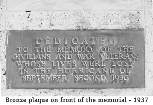 | Millions of vehicles have conceivably passed through Islamorada and overlooked the 1935 Hurricane Memorial. It is innocent enough in appearance, yet eloquent and highly significant in legacy as a memorial. For those who might wish to visit the site, it is located between the old State Road 4A highway and the present U.S. 1 at mile marker 81.5, across from the library. It was dedicated November 14, 1937 as The Florida Keys Memorial and memorializes the World War-I veterans and civilians who perished in the 1935 hurricane. The U.S. Department of Interior placed it on the National Register of Historic Places on March 16, 1995. The Harvey Seeds Post of the American Legion in Miami took the lead in obtaining $3,779 as a contribution of which $2,500 was cash. The finished cost was around $12,000. The memorial was designed by the Florida Division of the Federal Art Project and was constructed by the Works Progress Administration (WPA) in 1937 as Zone 3, Project Number 2217.