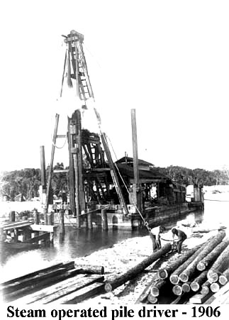 Bridge piles were driven by barge mounted pile driveres.